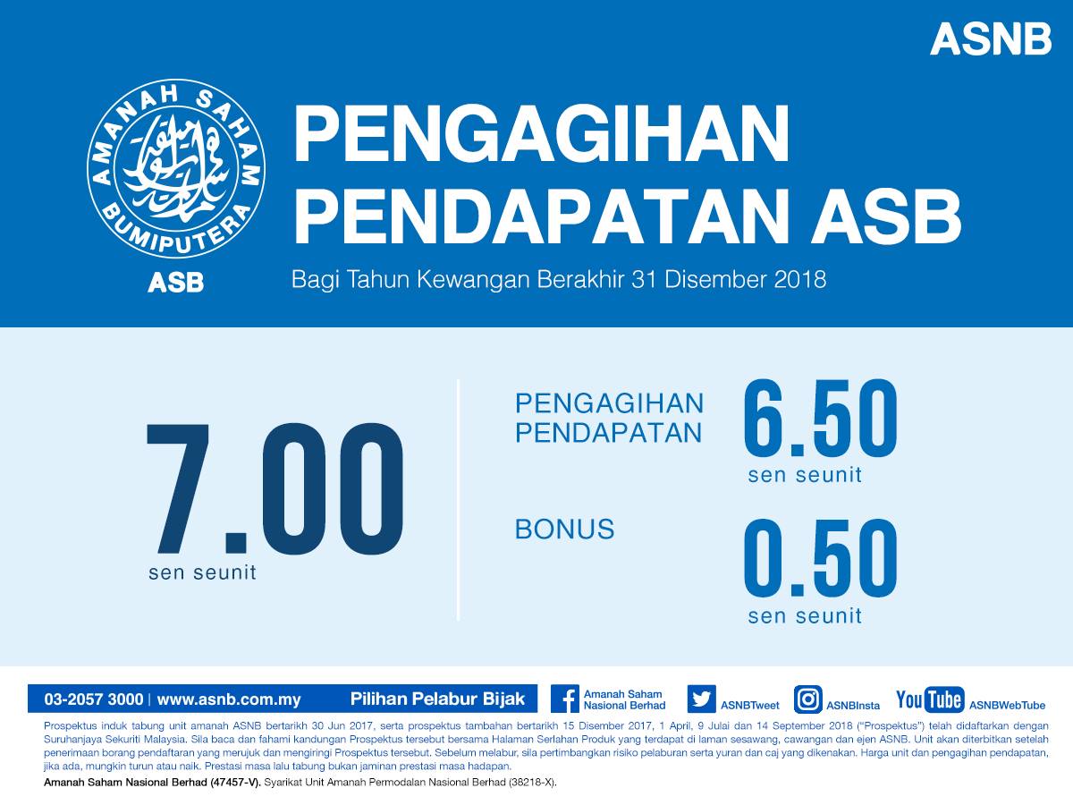 PNB telah mengumumkan agihan pendapatan ASB termasuk bonus sebanyak 7.00 sen seunit bagi tahun kewangan berakhir 31 Disember 2018.